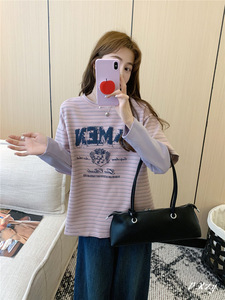016 秋季新款慵懒风拼接长袖上衣条纹字母印花打底衫女士T恤潮