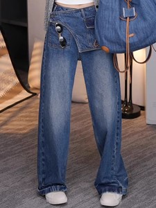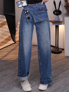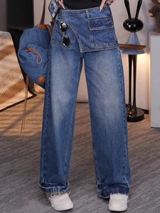 欧货小众设计假两件阔腿牛仔裤女2025春秋新款高腰宽松休闲直筒裤