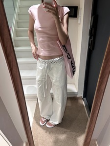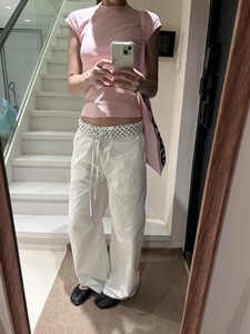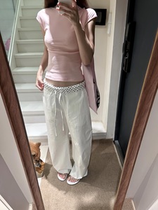 【现货】美式波点腰头拼接休闲阔腿裤女2025夏街头松紧腰白色垂感