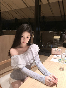 kubiliv【温柔涟漪】斜肩三层荷叶边细闪长袖针织衫一字肩T恤上衣