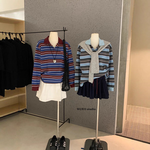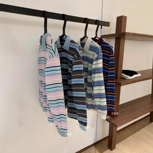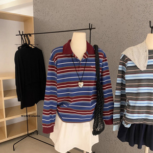 【WGWE】韩国复古撞色条纹polo领字母刺绣翻领长袖T恤W6796##