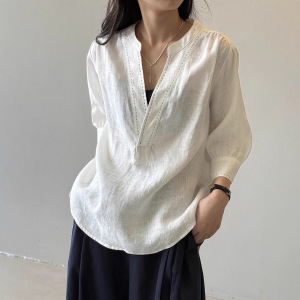 广州十三行高货爆款~V领亚麻五分袖衬衫女夏老钱风松弛感百搭上衣