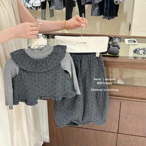 女童韩版套装春秋新款儿童宝宝洋气花边波点马甲阔腿裤三件31003