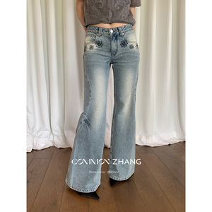 CZ ZHANG秋季法式时髦花卉绣花低腰提臀显瘦百搭微喇牛仔裤B31605