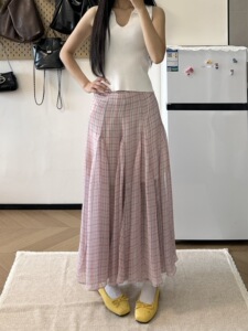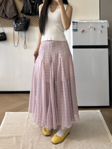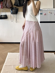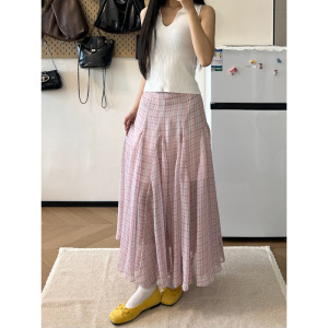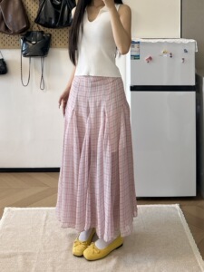 【现货】2025粉格半身裙女夏季垂感薄款雪纺格纹显瘦气质a字长裙