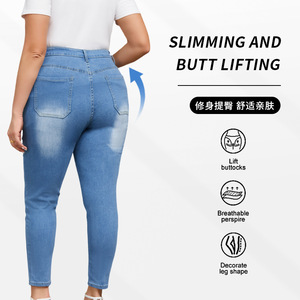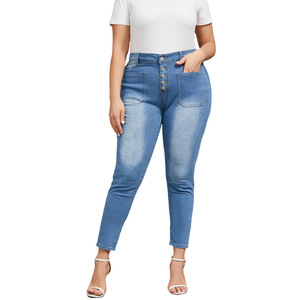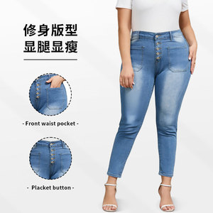 跨境亚马逊欧美大码女士 紧身小腿牛仔裤钉扣贴袋水洗长裤牛仔裤