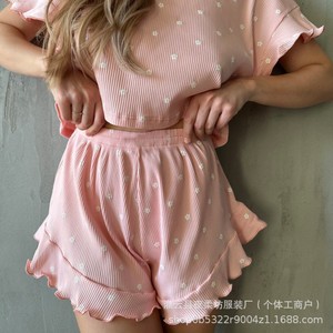 跨境2024夏季欧美女士休闲印花套装 荷叶短袖圆领短裤睡衣家居服