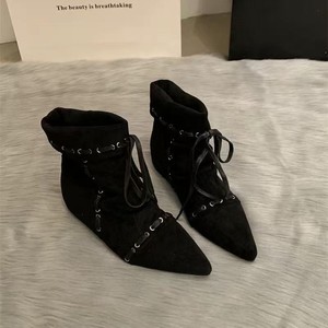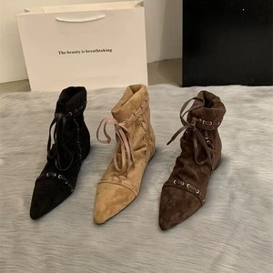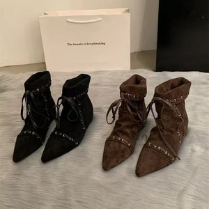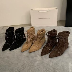 褶皱尖头小短靴女平底绑带2025夏秋复古小众美拉德西部牛仔靴时装