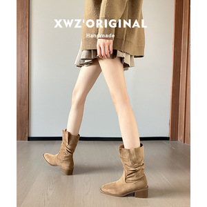 牛皮~马丁靴小个子内增高靴子女2025新款春季高跟中筒短靴堆堆靴