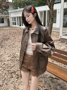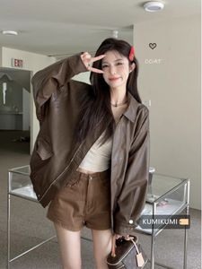 复古美式咖色皮衣夹克外套女秋季黑色甜酷风机车PU皮宽松长袖上衣