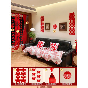 结婚客厅沙发背景墙简单大气全套布置新婚房长条喜字窗帘拉花装饰