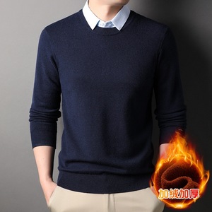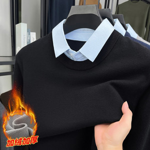 秋季新款假两件净版翻领中年针织衫男内搭毛衣加绒加厚衬衫领毛衣