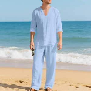 亚马逊跨境秋季宽松亚麻美式休闲男士沙滩V领设计长袖长裤套装男