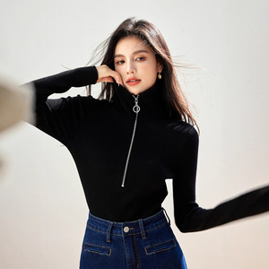 2025秋季新款拉链立领弹力打底衫修身显瘦黑色上衣针织衫女A6027