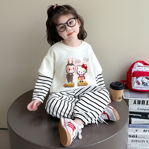 女童秋款套装洋气2025新款春秋韩版假两件卡通校园两件套织里童装