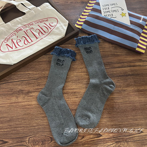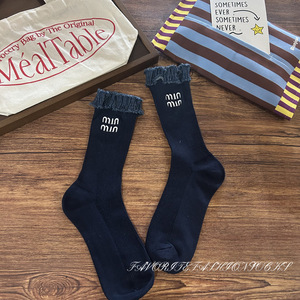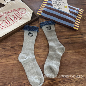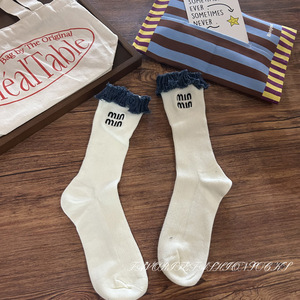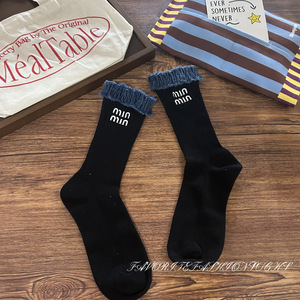 新款秋冬刺绣字母牛仔花边洋气时尚女袜韩系高定min堆堆袜潮袜