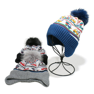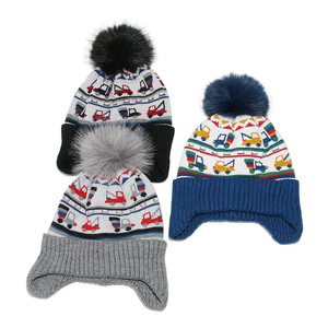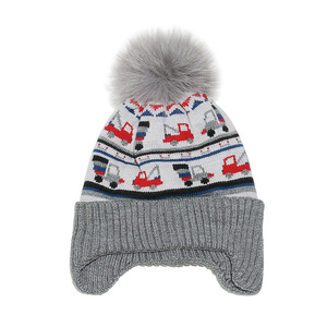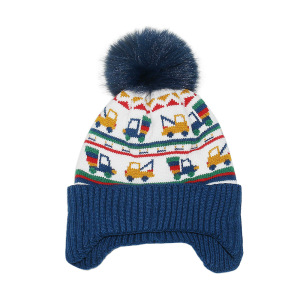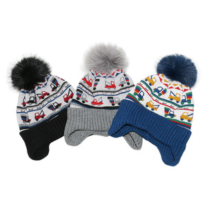 跨境欧美毛线帽儿童加绒加厚保暖冬帽工程车提花护耳套头针织帽子