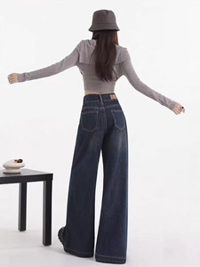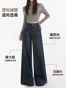 梵思羽复古蓝阔腿牛仔裤女春秋2025新款高腰宽松垂感直筒拖地裤子