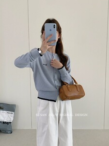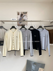 韩系百搭刺绣撞色针织开衫女装秋季显瘦设计感毛衣长袖打底上衣