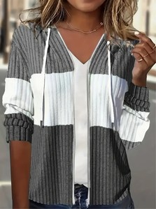 2025跨境独立站wish欧美秋冬时尚坑条撞色连帽休闲保暖拉链女外套