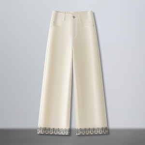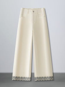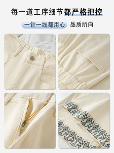 阔腿牛仔裤女2025新款小个子拼接花边秋季米杏色休闲裤窄版直筒裤