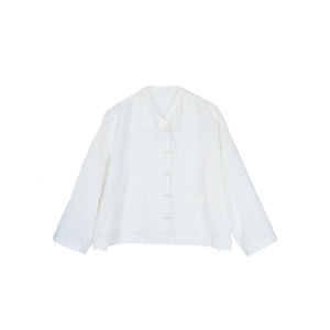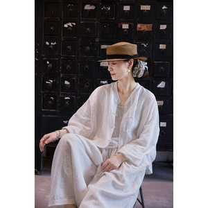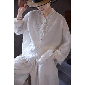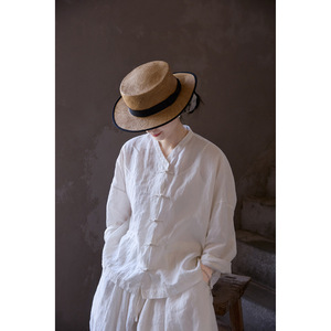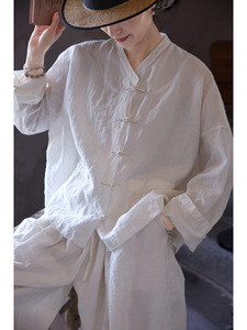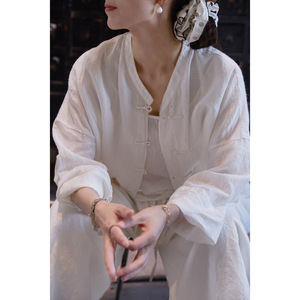 秋季新款文艺复古东方白亚麻轻盈亲肤中式V领禅意盘扣小衬衫