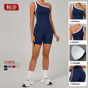 欧美撞色斜单肩美背瑜伽连体服女运动提臀紧身连体健身服1977