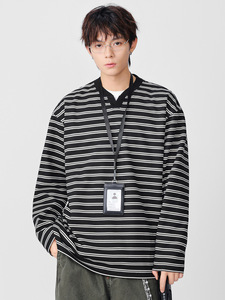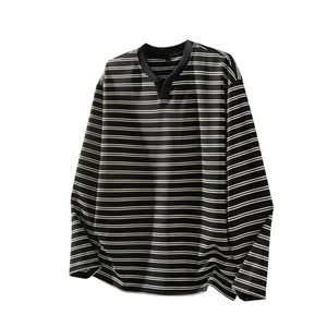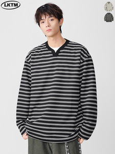 LKTM男装 韩系基础款V领条纹长袖T恤男女慵懒高级感宽松休闲上衣