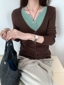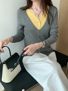 撞色假两件针织衫女秋季广州十三行2025新款韩版百搭修身显瘦上衣