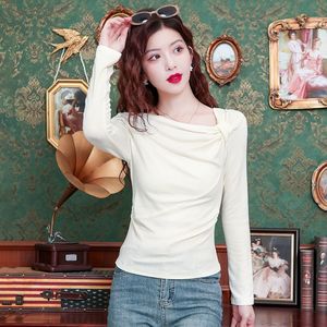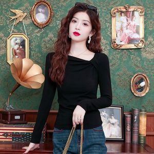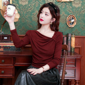 安可拉红斜领设计褶皱打底T恤秋季新款洋气修身百搭显瘦长袖上衣