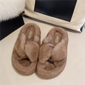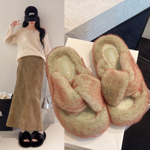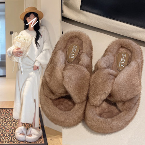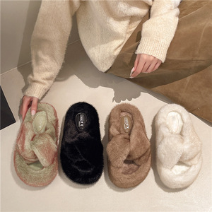 2025秋冬新款跨境外贸大码毛毛拖鞋厚底增高交叉保暖耐磨防滑亲肤