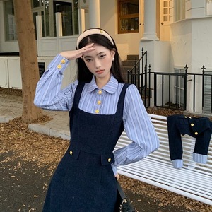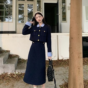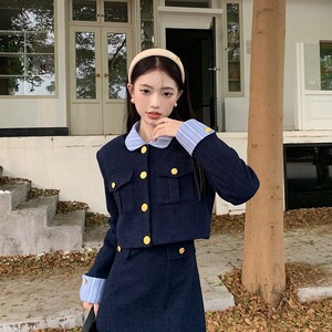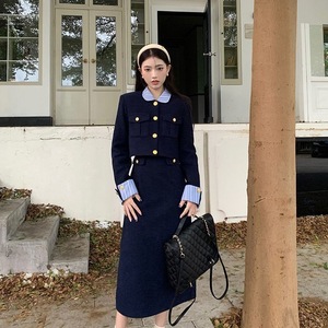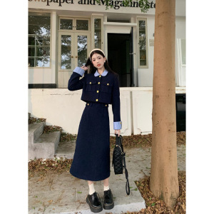 新品亚马逊欧美法式小香风长袖外套条纹拼接连衣裙秋冬时尚两件套