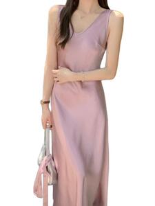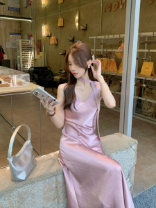 法式高级V领无袖背心连衣裙女夏季2025新款收腰醋酸缎面鱼尾长裙