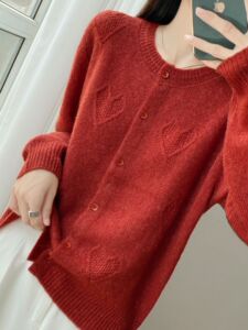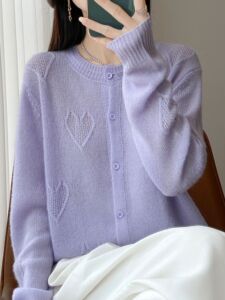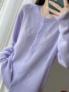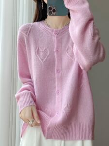 Baby肌绵柔丝羊毛秋季新款女装高奢七针提花心形圆领羊毛开衫外套