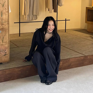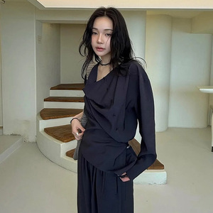 韩国东大门2025秋新高级气质荡领长袖衬衫阔腿直筒长裤两件套装女