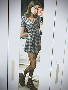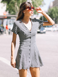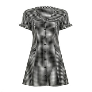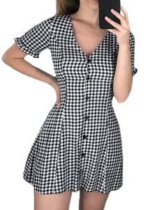 亚马逊欧美外贸女装气质格纹撞色V领显瘦排扣短袖A字连衣裙短2025