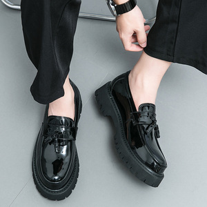 跨境批发2025英伦风男士黑白拼色皮鞋小个子增高懒人套脚厚底皮鞋
