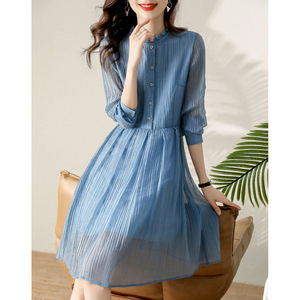 2025秋季新款初恋感蓝色高端气质高级感木耳边领网纱百褶连衣裙女