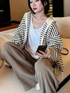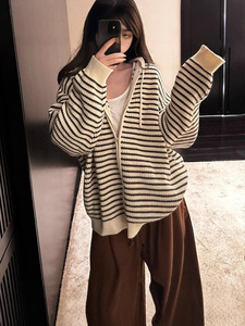 韩版休闲温柔风撞色条纹连帽针织开衫女秋冬新款宽松上衣毛衣外套