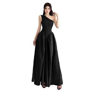 欧美风2025秋季新款女装宽松显瘦单肩设计立体花朵装饰长裙连衣裙