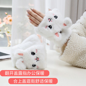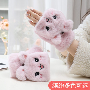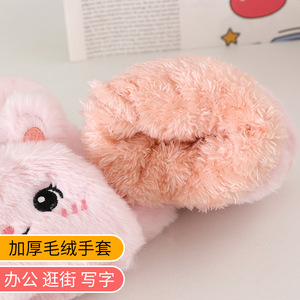 新款冬季可爱卡通兔子翻盖毛绒半指保暖加绒加厚骑行防寒手套批发