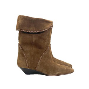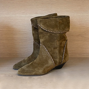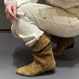 牛皮版~真皮小众复古尖头粗跟短靴女坡跟中筒西部雪美拉德牛仔靴