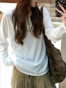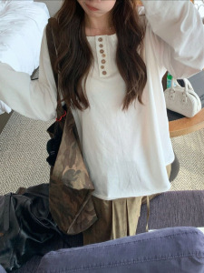 ASHENONLE 曲奇饼干 不规则扣罩衫上衣女卷边设计感长袖休闲T恤