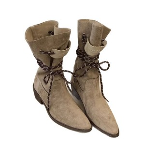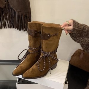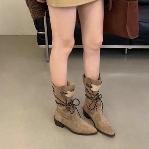 复古粗跟棕色绒面中筒堆堆靴女2025年新款瘦瘦靴春秋单靴西部短靴