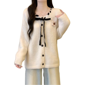 东大门新款法式小香风系带领蝴蝶结针织开衫女秋冬氛围感穿搭毛衣