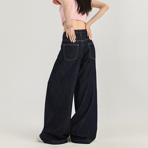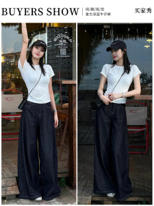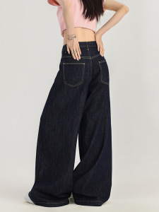 美式薄款深蓝阔腿牛仔裤女夏季新款小个子高腰宽松垂感直筒拖地裤