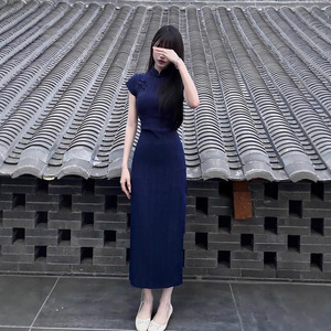 新中式女装改良旗袍长裙赫本风气质别致国风藏蓝色连衣裙子女夏季