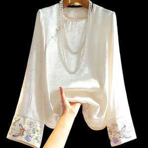 新中式圆领衬衫女春季国风重工刺绣提花盘扣长袖复古内搭改良上衣