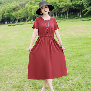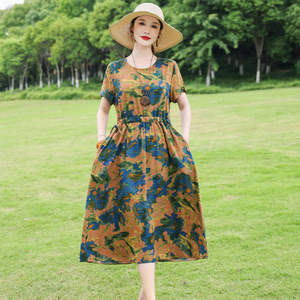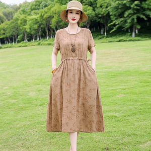 年轻妈妈夏天棉绸连衣裙宽松人造棉长裙带口袋女士收腰显瘦裙子