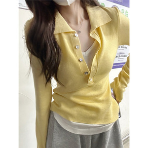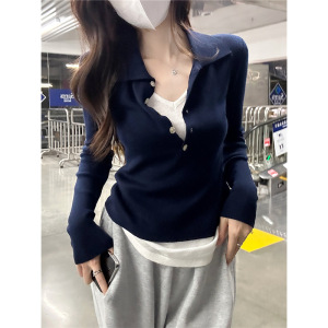 韩系假两件拼接领长袖针织衫女早春小众洋气修身撞色打底上衣